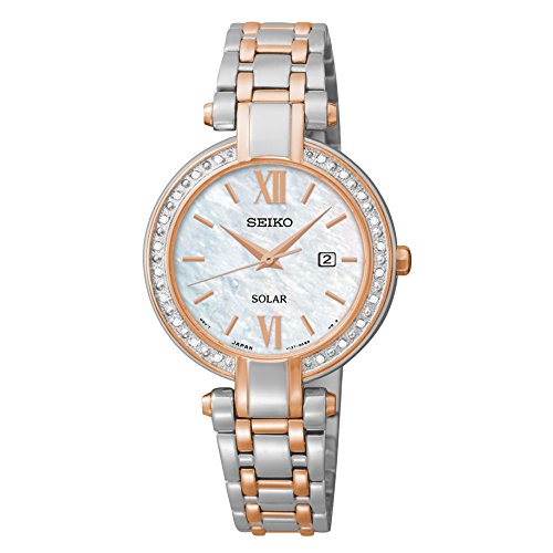 Elegance with a timeless style, this is the Seiko ladies watch. Featuring a two tone stainless steel bracelet, stainless steel case, mother of pearl dial, 20 stunning diamonds, date display, rose gold tone accents and the 'Seiko' logo to finish it off.