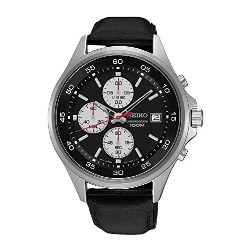 This gents Seiko watch has a stainless steel case and is powered by a chronograph quartz movement. It is fastened with a black leather strap and has a black dial. The watch also has a date function.