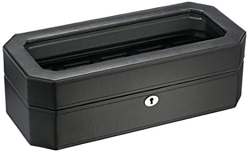 - Storage for five watches^Glass top^Lockable lid^Sturdy wood construction covered in supple black pebble material^Holds watches up to 52mm case size